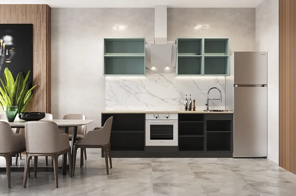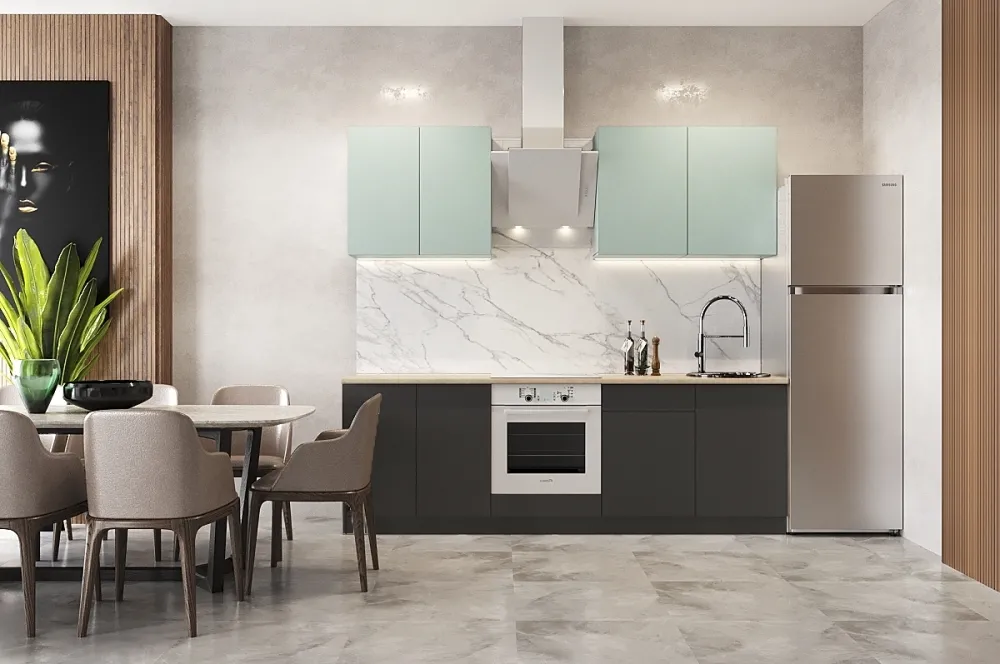 Ручки, столешница, стеновая панель, мойка, смеситель и бытовая техника продаются отдельно.